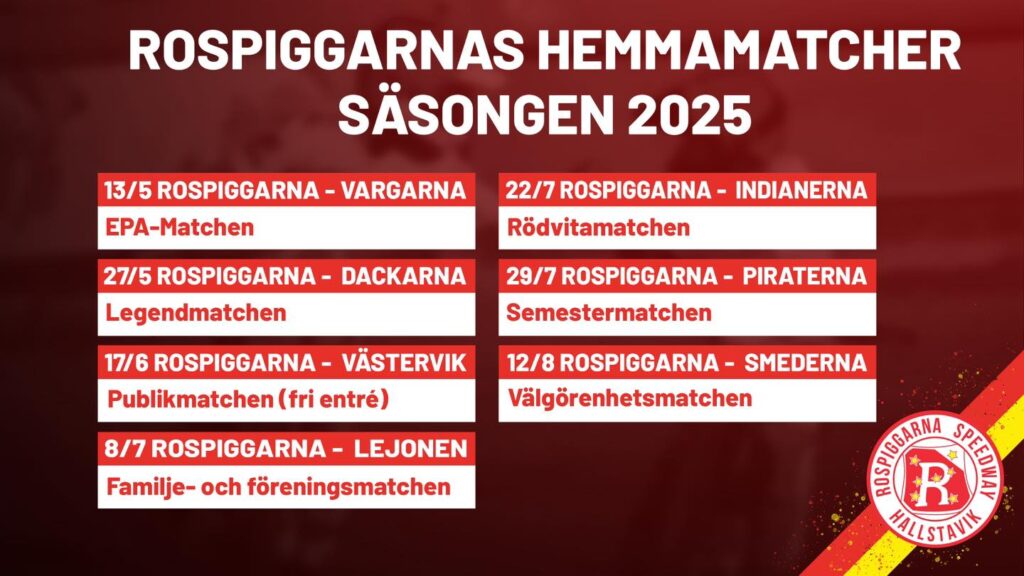 Rospiggarna Speedway är glada över att meddela att klubben och Hisstech Sverige AB har kommit överens om att förlänga avtalet. Därmed kommer arenanamnet vara Hisstech AB Arena även säsongen 2025. Hisstech AB är ett fullserviceföretag för drift, service och reparationer av hissar, trappor, portar och liknande anläggningar. Företaget blev ny…