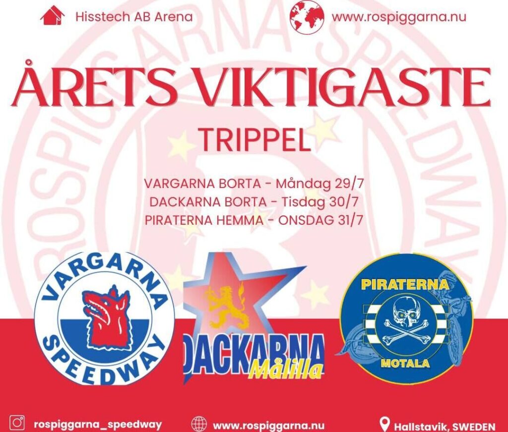 Nästa vecka väntar ett avgörande matchschema för Rospiggarna med tre matcher på tre dagar. Vi inleder veckan med bortamatcher under måndag och tisdag mot Vargarna samt Dackarna. Därefter vänder vi hem igen för att välkomna Piraterna till Hisstech AB Arena onsdagen 31 juli. Vi satsar på att göra en hat-trick,…