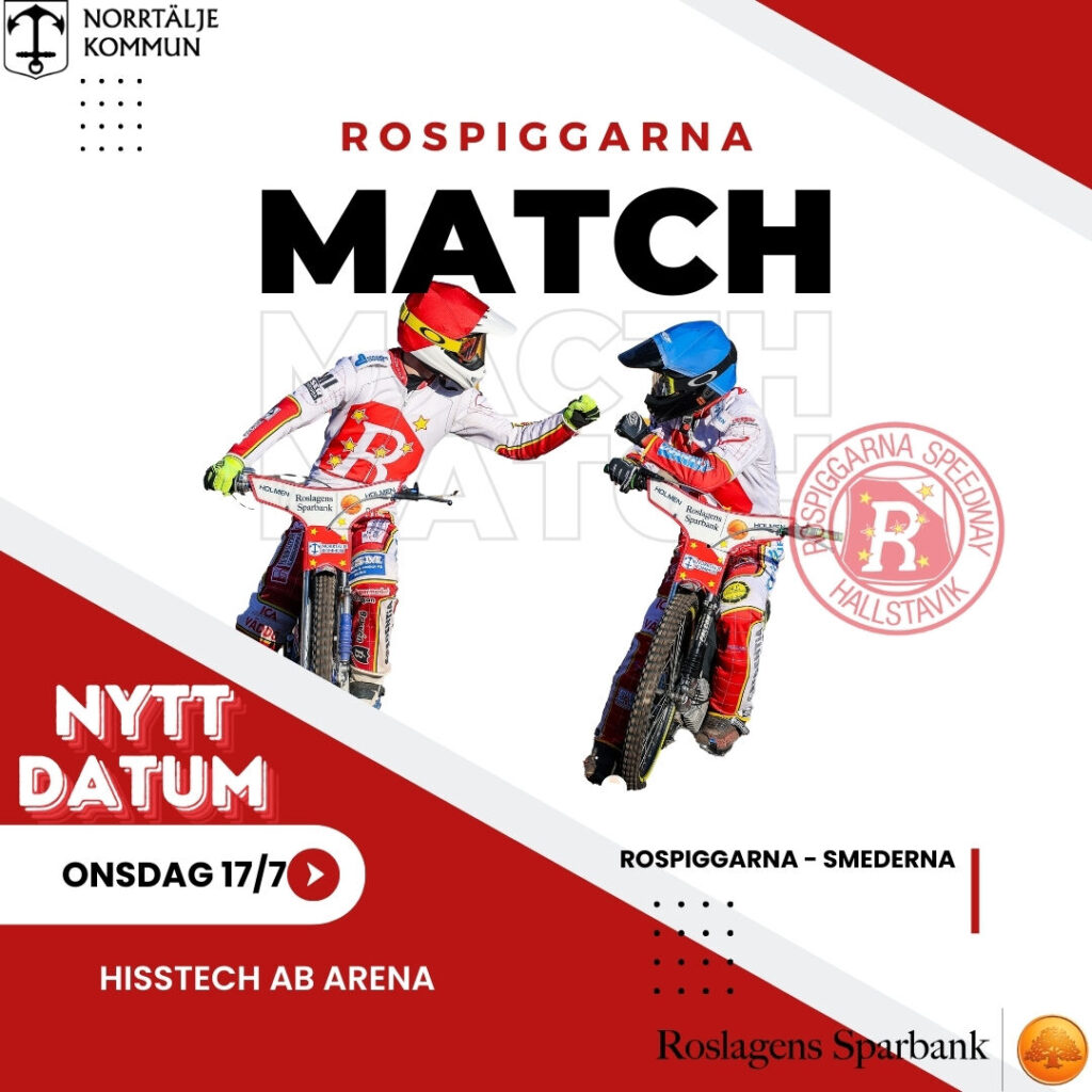 Som bekant regnade onsdagens hemmamatch mot Smederna bort. Nu är ett nytt datum bestämt. Matchen kommer att köras onsdagen 17 juli. Var du på plats på arenan när tävlingen blev inställd i onsdags gäller din köpta biljett igen. Matchstart är som vanligt 19:00. Varmt välkomna till Hisstech AB Arena!